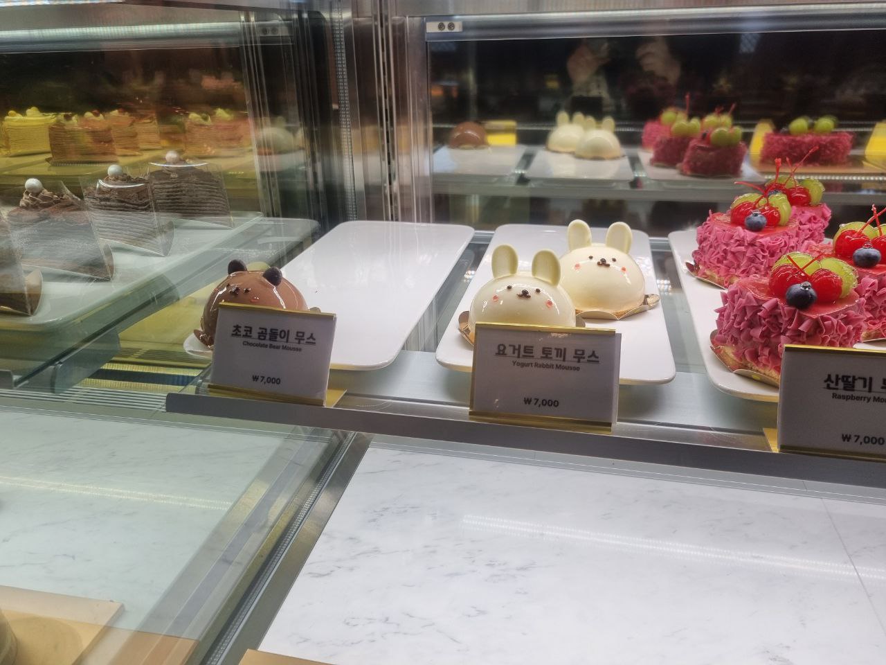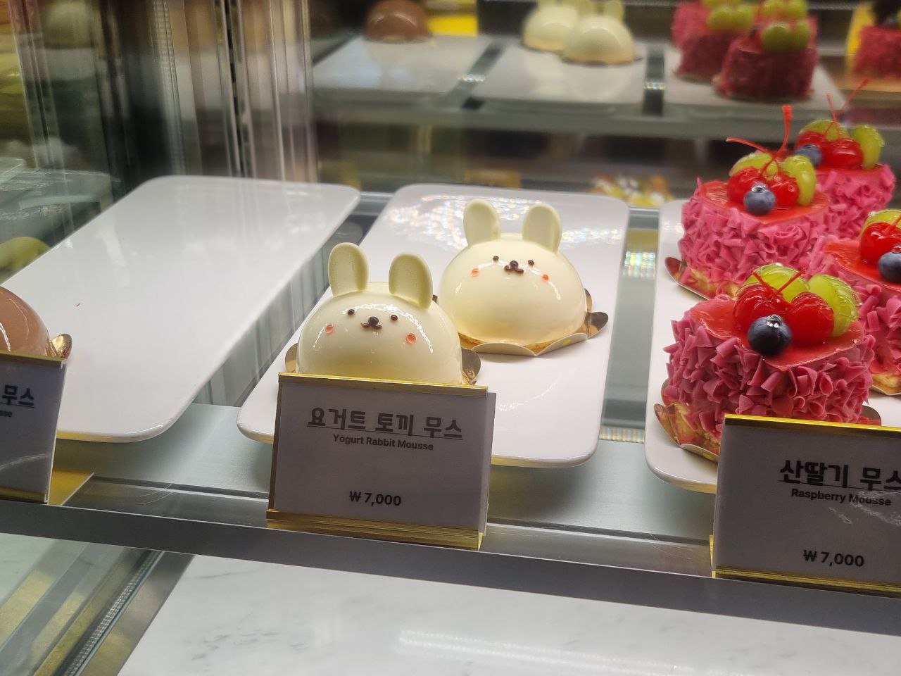 쇼케이스 안에 초코 곰돌이 무스 케이크랑 요거트 토끼 무스 케이크가 잔열되어 있다.